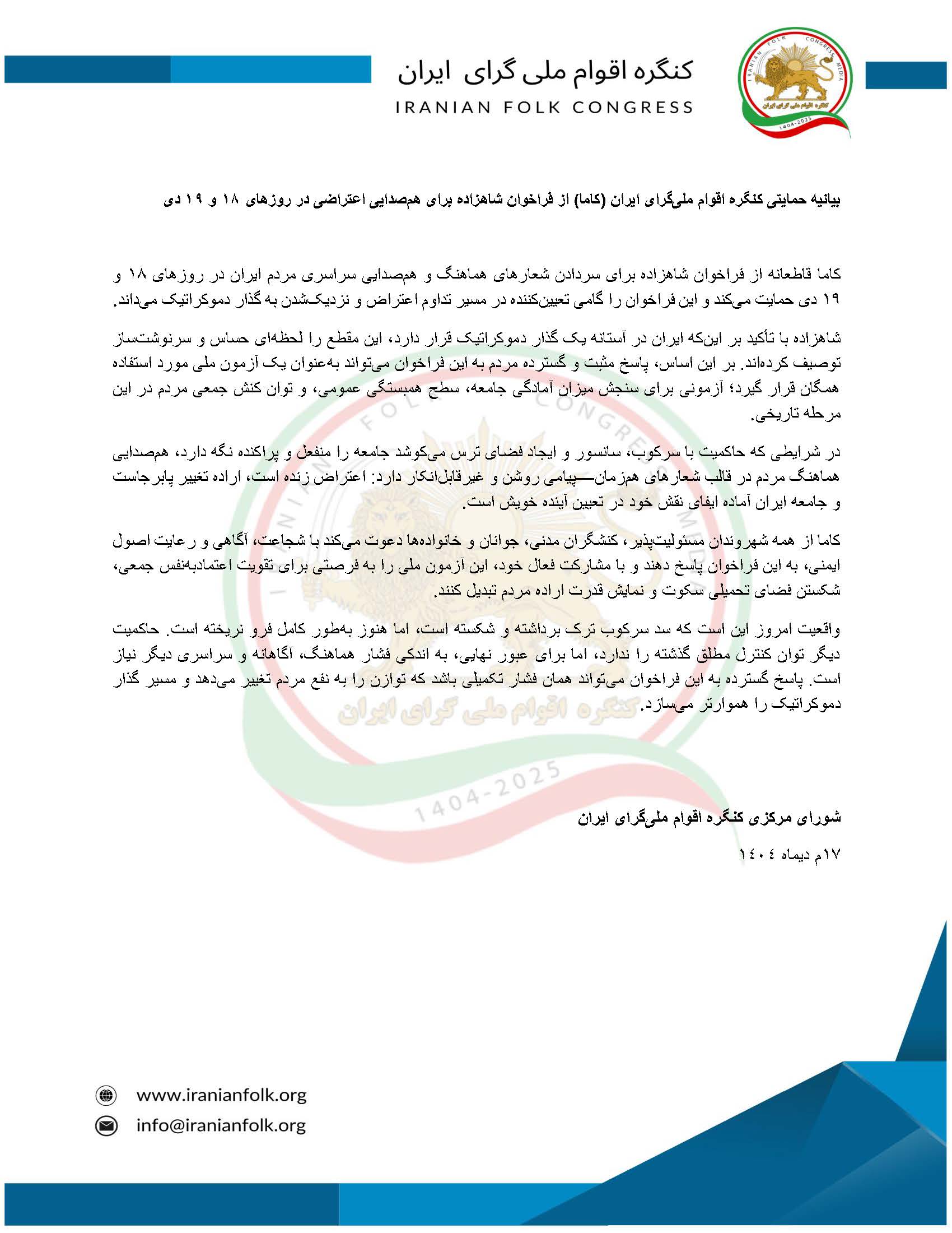 بیانیه حمایتی کنگره اقوام ملیگرای ایران (کاما( از فراخوان شاهزاده برای همصدایی اعتراضی در روزهای ۱۸ و ۱۹ دی